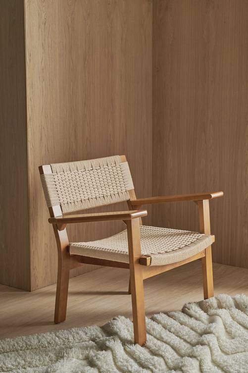 Fåtölj i björk med sits och rygg av dubbelt flätat och vaxat pappersrep. Levereras monterad. Höjd på armstöd från golv 62,5 cm (fram) och 51,5 cm (bak).