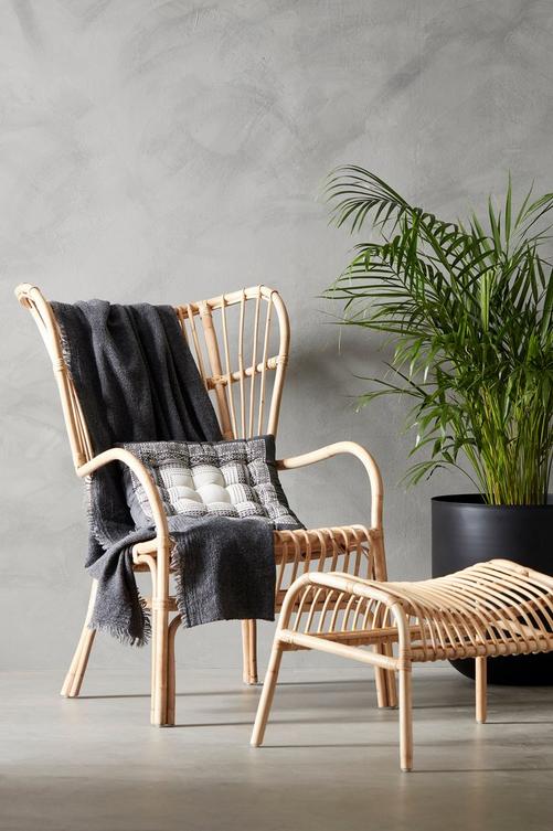 Fåtölj av rotting. Fåtöljen bör placeras under tak eftersom rotting är känsligt för både väta och uttorkning. Höjd 100, bredd 67, djup 90 cm. Sitthöjd 45, sittdjup 45. Höjd på ryggstödet från sitsen ca 62 cm. Monterad.