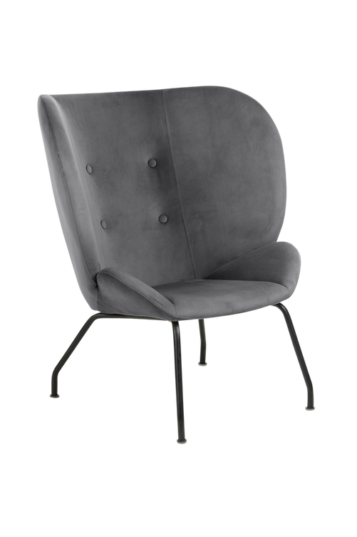 Karmstol med stoppning och sammetstyg. Ben av pulverlackerat stål.