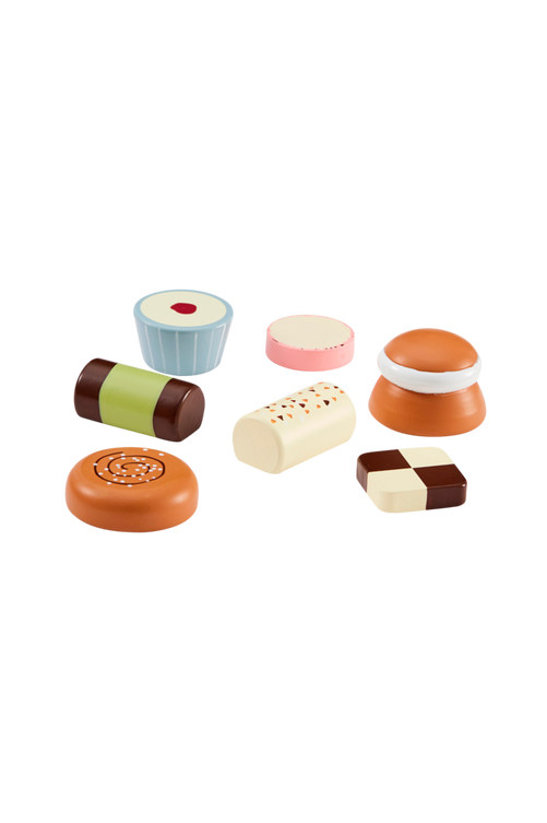 Fika kakor, perfekta till tradionellt "Kafferep" I denna mixade box med sju sorters klassiska svenska kakor finns syltkaka, scahckruta, semla, finsk pinne, brysselkex, dammsugare och kanelbulle. – Mått: Kakorna är mellan 3-5cm höga och 3-5cm breda – Material: Schima/MDF – Ålder: Från 3 år