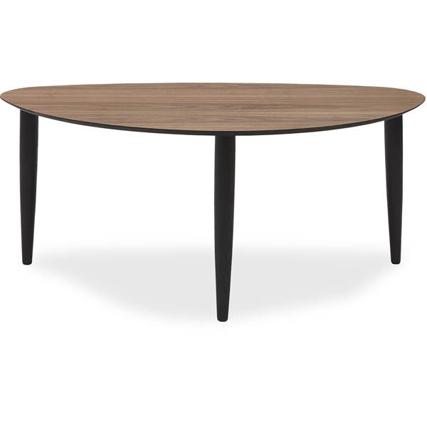 Soffbord, ingen hylla. – Oljebehandlad valnötsfaner, svart kant MDF och lackerade ben i svartbetsad massiv ek