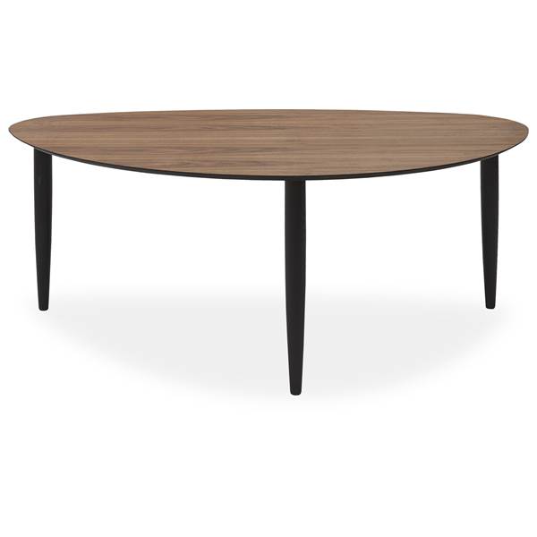 Soffbord, ingen hylla. – Oljebehandlad valnötsfaner, svart kant MDF och lackerade ben i svartbetsad massiv ek