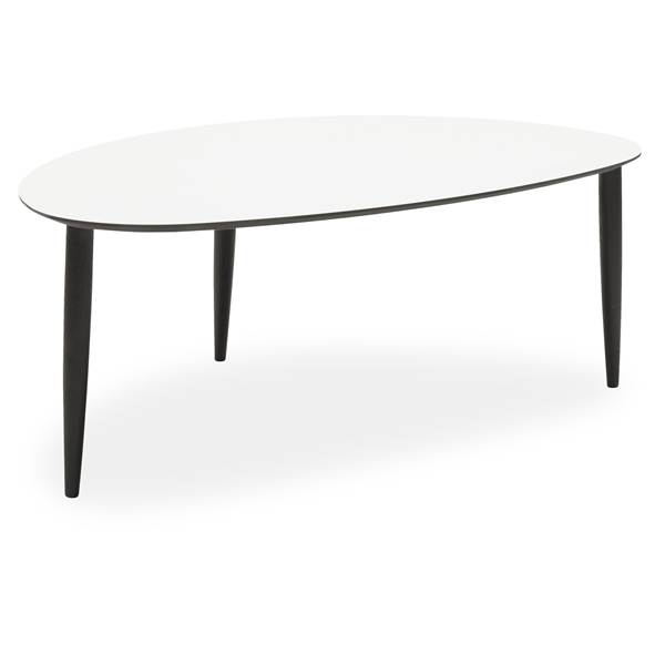 Soffbord, ingen hylla. – Vit laminat, svart kant MDF och lackerade ben i svartbetsad massiv ek