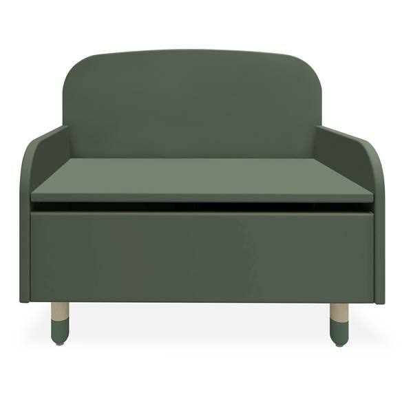 Barnbänk, med förvaring, med ryggstöd. – Deep Green MDF, ben i massiv ask och med förvaring