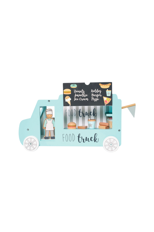 Med denna foodtruck kan du servera fantastisk mat på stående fot och enkelt förflytta dig till platser där hungriga kunder finns Vagnen har en meny som visar all god mat som erbjuds och även en lucka som kan stängas när det är dags att slå igen för dagen. Med denna meny blir du lätt populär bland dina vänner då det erbjuds både hamburgare, glass och pizza mm. Mat som barn älskar och känner igen! Självklart ingår även en kock som lagar maten och kör foodtrucken så det är bara för dig att ta beställningar och servera dina gäster. Kom och ät! Följande delar ingår: 1 food truck 1 kock 1 donut 2 glassar 1 hamburgare 1 korv m bröd 1 pizza slice 1 dricka 1 avtagbar flagga – Ålder: Från 3 år – Material: Trä – Mått: 45 x 18 x 24 cm