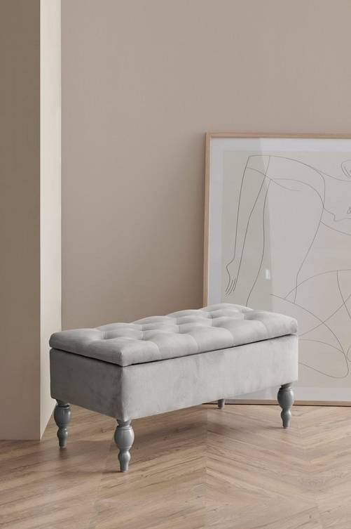Förvaringsbänk med klädsel i polyestersammet och trästomme. Stoppning av polyeter. Träben. Förvaringsutrymme i bänken, uppfällbart lock med gångjärn och gasfjädrar som gör att locket öppnas och stängs mjukt och dämpat utan klämningsrisk. Bredd 80 cm, djup 40 cm, höjd 40 cm. Lev. monterad. Vill du titta närmare på ett tyg och känna på kvaliteten innan du väljer klädsel? Mejla oss på info@ellos.se eller ring 033-33000 och beställ hem ett gratis tygprov! Ange det artikelnummer som står framför den färg du önskar.