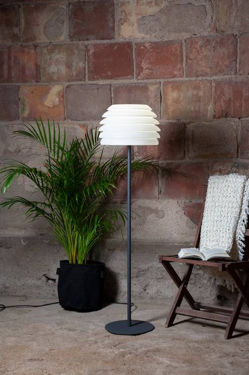 Golvlampa med stativ av metall och veckad skärm av plast. Lampan är avsedd att användas på uteplatsen, altanen eller balkongen. Förändra ljusskenet genom att prova olika typer av ljuskällor. Material: Metall och plast. Storlek: Höjd 150 cm, ø 37 cm. Sockel/lampa: 1 st E27, max 25 w glödlampa eller max 5 w lågenergilampa. Ljuskälla medföljer ej. Tips/råd: FRED finns även som bordslampa så du kan skapa en mysig hörna utomhus med den rätta belysningen.