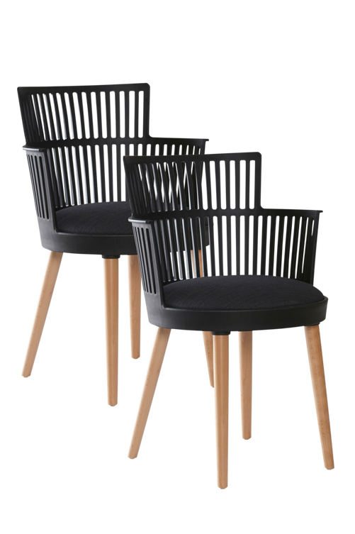 2-pack stolar med plastryggstöd av polypropylen, stoppad sits med skumfyllning av polyuretan och polyesterklädsel, ben av massiv björk. En modern stol med runda former, armstöd och bra sittkomfort. Stolen ger ett nätt intryck med sin luftiga rygg och passar lika bra vid middagsbordet eller som solitär i hallen. Material: Polypropylen, björk, polyester och polyuretan. Storlek: Höjd 81 cm, bredd 56,5 cm, djup 54 cm, sitthöjd 45 cm. Höjd upp till armstöd: 55,5 cm. Skötselråd: Torkas med fuktig trasa. Tips/råd: Blanda gärna stolen med andra färger och material för att skapa en härlig mix runt bordet.