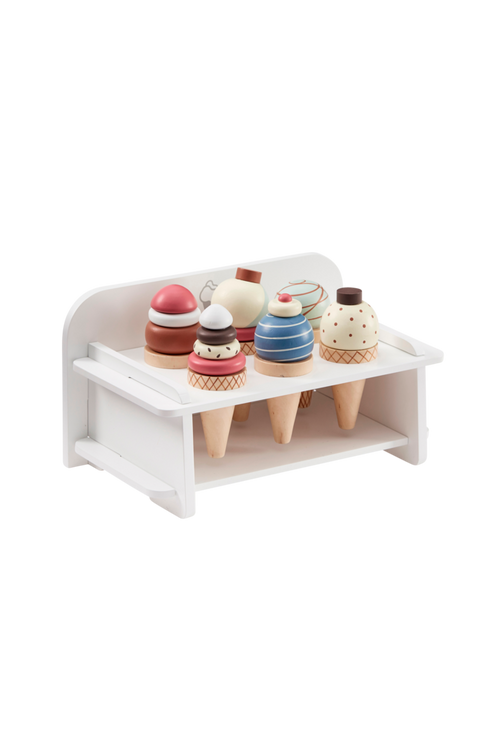 Glasställ i trä med 6 stycken glassar Glasstället är vit- och pastellfärgat och glassarna är designade att likna olika glassmaker. Passar perfekt till att sälja i leksakskiosken eller affären. – Mått: 26 x 17,5 x 14 – Material: MDF/schima – Ålder: Från 3 år