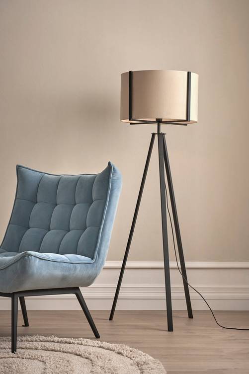 Golvlampa med fot och skärmhållare av metall med matt finish. Textilskärm med grövre struktur. Skärmens mått: Diameter 50 cm, höjd 30 cm. Sladd med golvströmbrytare. Ljuskälla ingår ej.