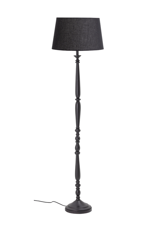 Vacker golvlampa av svarvat svartmålat gummiträ och linne skärm. Ljusknapp på golvet. Diameter 42 cm. Levereras omonterad.