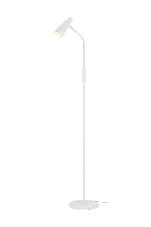 Crest golvlampa i metall med riktbar skärm. 2 meter transparent kabel i plast, med brytare på lampstången och väggkontakt. Max 1 x 7W. GU10-sockel. Ljuskälla ingår ej.