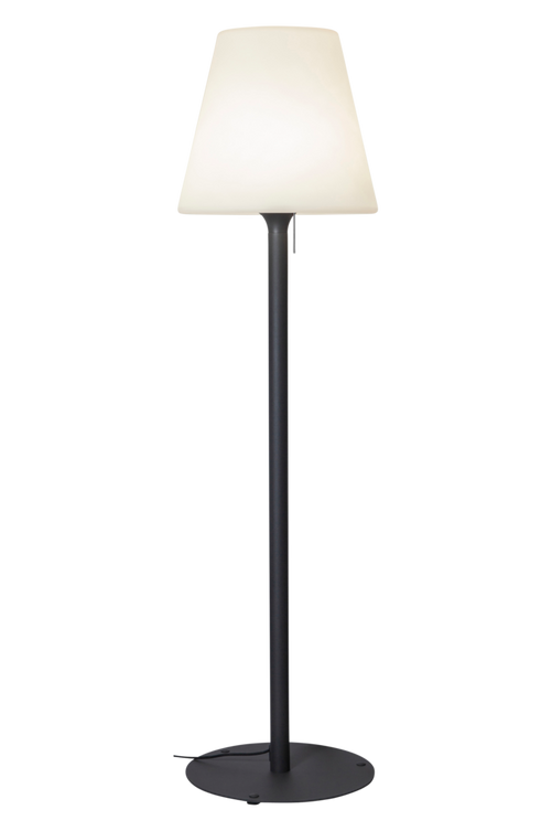 Golvlampa för utomhusbruk på svart fot med vit skärm. Passar perfekt till uteplatsen, altanen eller trädgården. Svart anslutningskabel, sladdlängd 5 m. Storlek: Höjd 184 cm, bredd 50 cm, djup 50 cm. Sockel/lampa: 1 st E27, max 40 watt glödlampa. Ljuskälla medföljer ej.