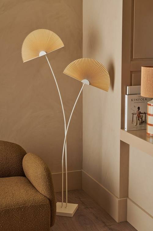 Golvlampa av metall i matt finish med två plisserade skärmar av papper. Skärmens mått: Diameter 40 cm, höjd 20 cm. Fotplattans mått: 20×20 cm. Sladd med fotströmbrytare. Ljuskälla ingår ej.