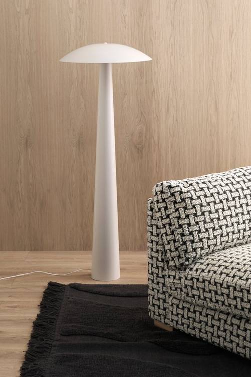 Golvlampa av metall. Skärmens mått: Diameter 50 cm, höjd 12 cm. Lampfotens diameter nedtill 10 cm. Sladd med golvströmbrytare, sladdlängd 250 cm. Sockel 2x E27. Ljuskällor ingår ej.