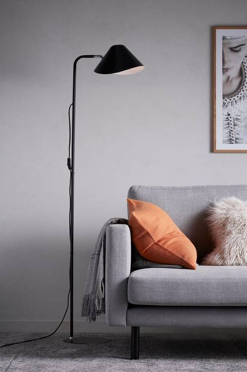 Golvlampa av metall med kromade detaljer. Skärmen är justerbar i höjd- och sidled. Lampans höjd 163 cm. Djup 40 cm. Bottenplatta Ø 25 cm. Skärm med vit insida, mått 28×27 cm. Textilsladd med strömbrytare, sladdlängd 2,5 m. E27. Max 40 W. Ljuskälla ingår ej.
