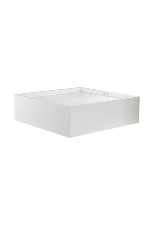 Kvadratiskt soffbord i MDF. Soffbordets bordsskiva är utformad som en stor bricka som sänks ned i soffbordet och undertill får du en praktisk förvaring. Bordsskivan har två runda, dekorativa hål som har handtag på två sidor. Det låga bordet ger en mysig stämning till din soffhörna samtidigt som du utnyttjar utrymmet till förvaring. Material: MDF. Storlek: Höjd 30 cm, bordsskiva 100×100 cm (inklusive sargen). Skötselråd: Torkas av med lätt fuktad trasa. Formgivare: Jotex Design Studio.