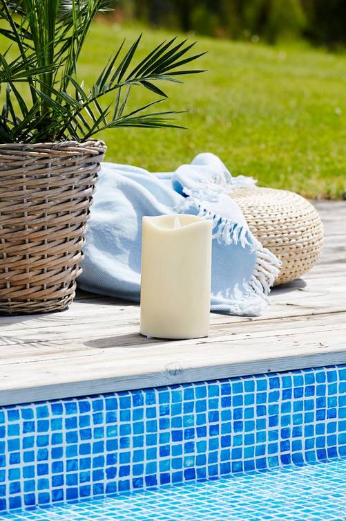 Plastljus för utomhusbruk med ett flimrande sken. Ljuset har en repeterande timer som är på i 6 timmar och av i 18 timmar. Tryck på brytaren för olika val: 1 för konstant sken. 2 för 6 timmars-timer. 3 för av. Drivs med 3 st C-batterier. Batterier medföljer ej. Material: Plast. Storlek: Höjd 21 cm, ø 12 cm. Sockel/lampa: LED. Ljuskälla medföljer.