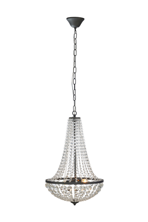 Gränsö kristallkrona från Markslöjd. Svart metall och klara prismor. 1,5m kedja och krok upphängning. Små socklar (E14) för max 2x 40W glödljus eller motsvarande i halogen, lågenergi eller LED. Ljuskällor ingår ej. Bredd (cm) 40 Höjd (cm) 55 Djup (cm) 40 Effekt (W) 40W Sockel E14 Takkontakt ingår ej på grund av nytt EU direktiv. De finns att beställa separat.