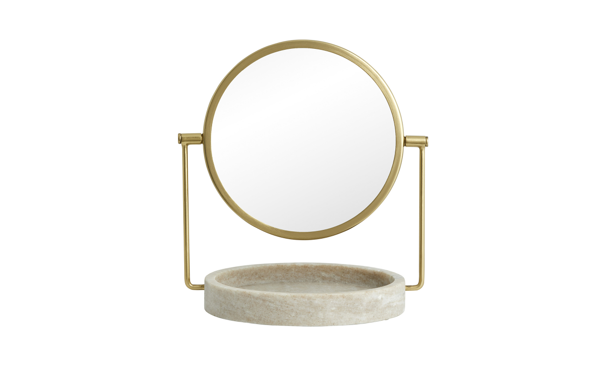 Haja är en söt spegel som är perfekt för sminkbordet eller som dekoration på en hylla. Spegeln har en smal metallram i guldfärg och står stadigt med en fot i marmor. På baksidan finns en spegel med förstorande effekt, vilket gör det lättare att se mindre föremål.Design & egenskaperSöt spegel perfekt för sminkbordet och med förstorande effekt.Spegelns fot kan liknas vid en bricka där mindre föremål kan förvaras.Tillverkad i metall, spegelglas och marmor.Leverans & förpackningLevereras monterad.Antal förpackningar: 1 stVikt: 2,17 kg