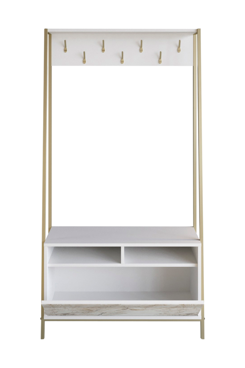 100% spånskiva med melaminbeläggning tjocklek: 1,8 cm ben av metall bredd: 94 cm höjd: 180 cm djup: 35,3 cm flera hyllplan kan fästas i väggen