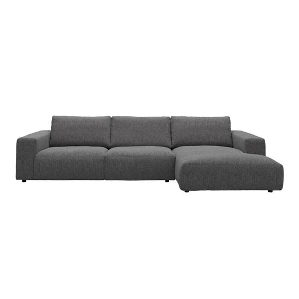 3 sits högervänd Soffa med schäslong, . – Yelda Grey klädsel, ben i svart plast och S:skum/fib/din/sili R:Dun/skum