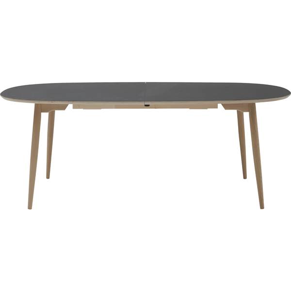 Matbord, med ben, utdragbar för 2 tilläggsplatser, utan iläggsskiva. . . – Topp i svart linoleum, kant i björkkryssfaner och ben i obehandlad ek