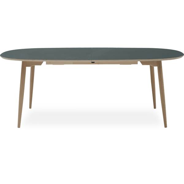 Matbord, med ben, utdragbar för 2 tilläggsplatser, utan iläggsskiva. . . – Ovansida i grönt linoleum, kant i björkkryssfaner och ben i obehandlad ek