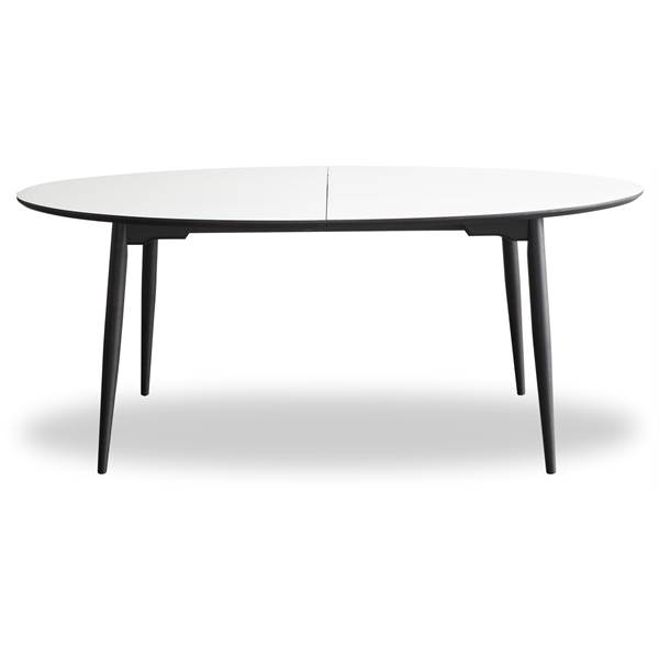 Matbord, utdragbar för 2 tilläggsplatser, utan iläggsskiva. . . – Topp i vit laminat, kant i svartbetsad kryssfaner och ben i svartbetsad bok