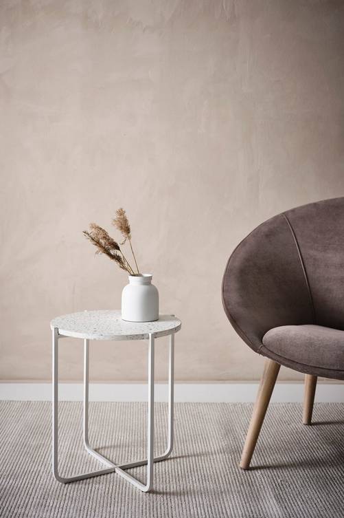 Det runda sidobordet HEYWOOD har en vacker bordsskiva av terrazzo och bordsunderrede av pulverlackerad metall med matt yta. De två materialen står i snygg kontrast till varandra. Terrazzo är en stenskiva med en bas av cement som blandas upp med krossad naturstesten av olika slag. Blandningen av natursten gör varje stenskiva unik och gör att den varierar i utseende från produkt till produkt. Materialet är slitstarkt och har en slät yta. Viss montering krävs. Material: Järn och terrazzo. Storlek: Höjd 46,5 cm, ø 42 cm. Skötselråd: Torkas av med lätt fuktad trasa. Torka omedelbart upp utspilld vätska på terrazzo. Använd alltid glasunderlägg. Undvik sura vätskor, såsom vin, citrus, vinäger etc. För daglig rengöring använd såpvatten.