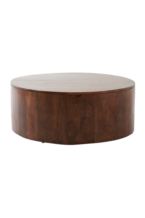 Bord och förvaring i samma möbel. Bättre än så blir det inte. Detta snygga, runda bord i massivt trä med valnötsfinish har halva bordsskivan öppningsbar och stort rymligt förvaringsutrymme inuti. Ett diskret snidat grepp i sidan gör det enkelt att komma åt och lyfta skivan. Har du behov av förvaring kommer detta bordet att göra dig lycklig. Material: Trä och metall. Storlek: Höjd 35 cm, ø 90 cm. Beskrivning: Runt soffbord i mangoträ med valnötsfinish. Öppningsbar bordsskiva med metallkedjor i sidorna. Skötselråd: Torkas av med lätt fuktad trasa. Tips/råd: Samla vackra ljusstakar i olika höjd på bordet och få en mysig upplevelse varje kväll när mörkret faller.
