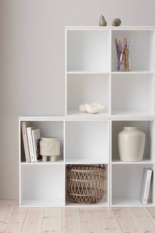 Med fyra fack. Av målad MDF. Levereras omonterad. Bredd 74 cm. Höjd 74 cm. Djup 36 cm.