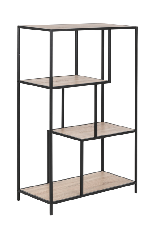 Assymetrisk hylla, pulverlackad metallstomme och ek folie. Montera själv. Mått: Höjd: 114 cm. Bredd: 77 cm. Djup: 35 cm.