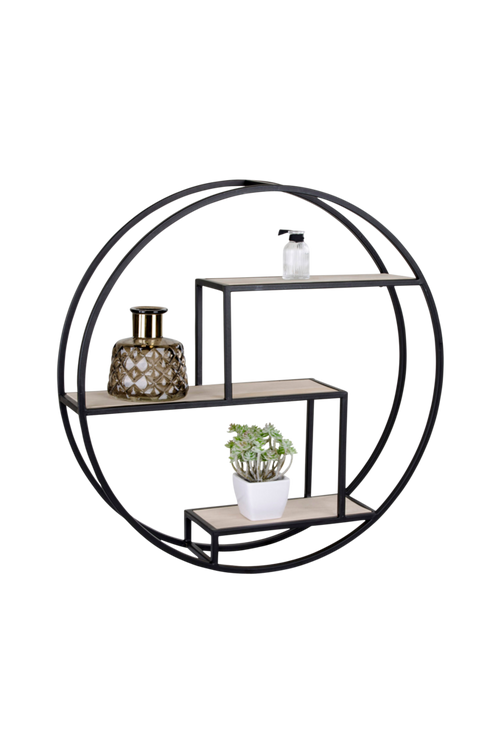 Rund hylla med ram och naturligt trä. Mått: Bredd: 60 cm. Längd: 13 cm. Höjd: 60 cm. Material: stål och trä. Monterad.