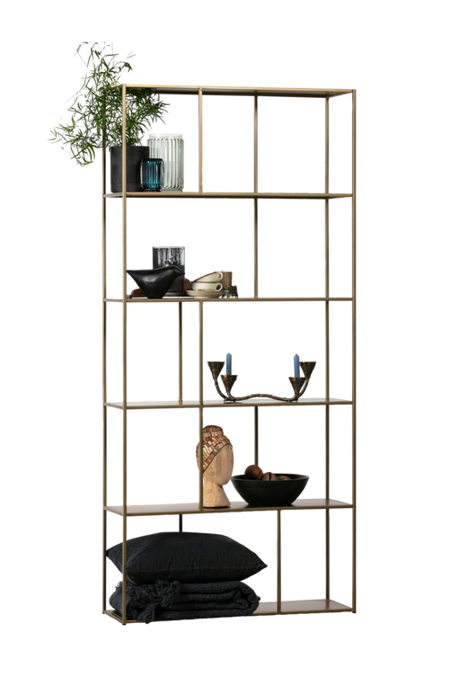 Hyllan Valued (hxwxd) 196x90x30 cm är tillverkat i stål med en antik mässing. Stålhyllorna är 1 cm tjocka. De stora facken har en bredd på 58 cm och en höjd i 37-38 cm. De små facken har en bredd på 28 cm och en höjd i 37-38 cm. Produkten väger 21,5 kg och levereras monterat.