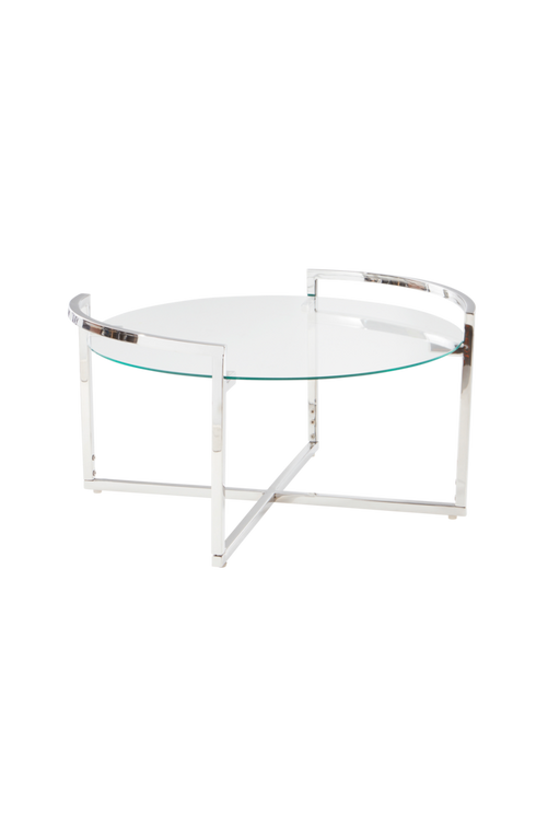 Runt soffbord med bordsskiva av härdat klarglas och ben av stål med högblank yta. Glasskivan i kombination med att stålprofilen kommer upp ovanför bordsskivan ger bordet speciell karaktär. Underredet har modern och stilren design som ger en lätt och fräsch känsla. Det är tillverkat av stålprofil som är fyrkantig med mjukt rundade kanter och bordsskivan vilar nedsänkt i benstativet. Viss montering krävs. Material: Glas och stål. Storlek: Höjd 40 cm, ø 76 cm. Bordsskiva ø 70 cm, fri höjd under bordsskiva 34 cm. Skötselråd: Torkas av med lätt fuktad trasa och glasputs.