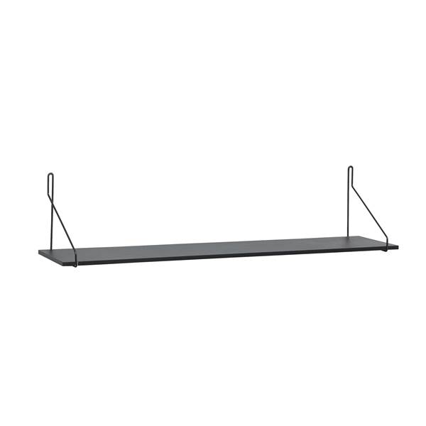 Vägghylla, maxbelastning 5 kg. per hylla. – Sidor i svartlackerad metall och hylla i svart melamin