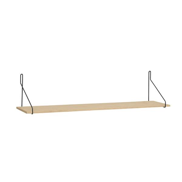 Vägghylla, maxbelastning 5 kg. per hylla. – Sidor i svartlackerad metall och hylla i ekfaner
