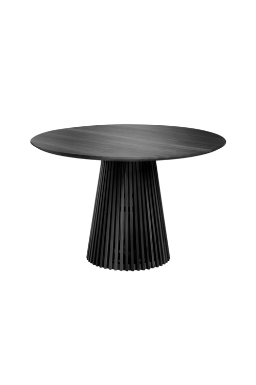 Bord av svartmålat massivt minditrä med synliga fibermönster som gör varje bord unikt. Stommen är tillverkad i en originell design med delar av samma slags trä i naturfärg, placerade en i taget. Möbeln är unik och äkta, precis som du! Material: Trä. Storlek: Höjd 78 cm, ø 120 cm. Skötselråd: Torkas av med lätt fuktad trasa.