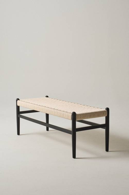 Bänk i massiv björk med sits av papperssnören som flätats. Kontrasten mellan papperssnöre och trä blir effektfull och sitsen ger bra sittkomfort. Material: Trä och papper. Storlek: Höjd 45 cm, längd 120 cm, djup 45 cm. Sköteslråd: Torkas av med lätt fuktad trasa. Formgivare: Jotex Design Studio.