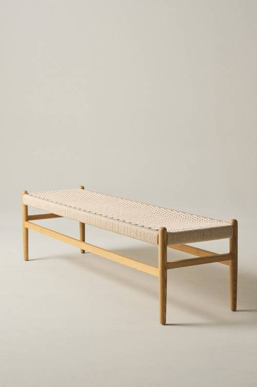 Bänk i massiv björk med sits av papperssnören som flätats. Kontrasten mellan papperssnöre och trä blir effektfull och sitsen ger bra sittkomfort. Material: Trä och papper. Storlek: Höjd 45 cm, längd 160 cm, djup 45 cm. Sköteslråd: Torkas av med lätt fuktad trasa. Formgivare: Jotex Design Studio.