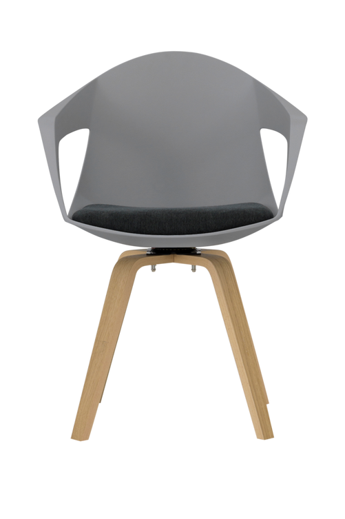 Denna snygga karmstol har snurrfunktion, är lättskött och bekväm med en sits av plast och sittpad i tyg med stoppning, ben i bockad björk med ett yttre skikt av ekfanér.