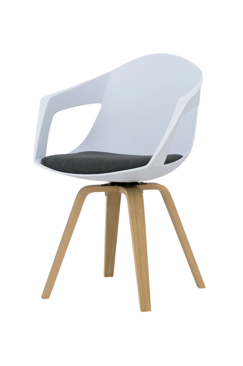 Denna snygga karmstol har snurrfunktion, är lättskött och bekväm med en sits av plast och sittpad i tyg med stoppning, ben i bockad björk med ett yttre skikt av ekfanér.