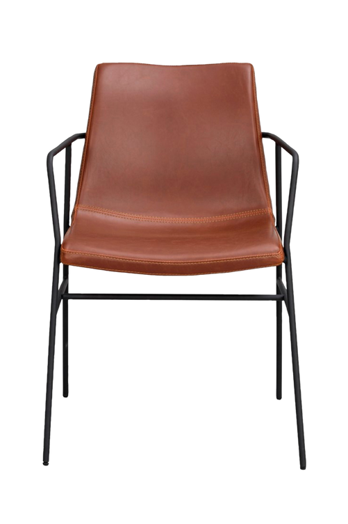 Huntington karmstol i brunt konstläder och med svarta metallben. Detta är en modern stilsäker och skön stol som passar till de flesta matbord. Stolen finns även med svart sits och är designad av oss på Rowico.