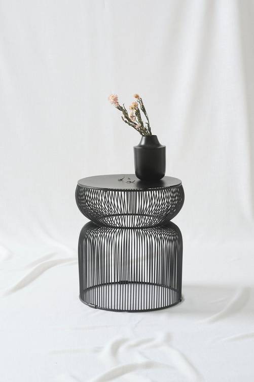 Runt sidobord av järn, ett snyggt formad underrede av runda svarta metallstaver i mjuka former. Bordsskivan i samma material smälter in fint. Bordets design är både generös och nätt tack vare det luftiga underredet och bordet passar lika bra i den moderna stilen som i hemmet med retrostil. Material: Järn. Storlek: Höjd 46 cm, bordsskiva ø 42 cm. Skötselråd: Torkas av med lätt fuktad trasa. Tips/råd: Snyggt som solitär på en plats där du vill skapa ett blickfång.