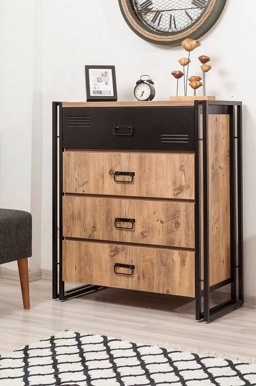 Material: 100% Melaminbelagd spånskiva Metallram (Tjocklek: 2 cm) Metallplaterade lådor Teleskopiska lådor Metallhandtag Mått: 90 x 100 x 40 cm