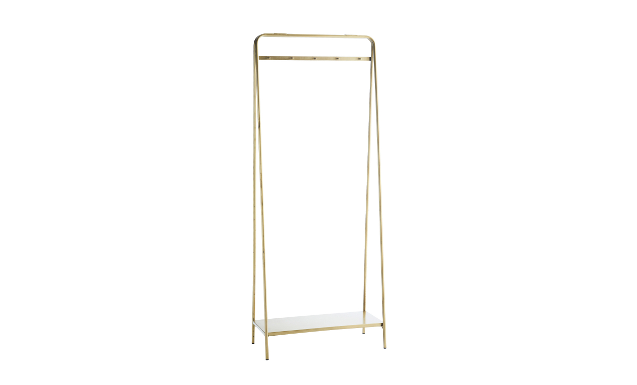 En klädhängare är ett måste i sovrummet eller hallen där du kan visa upp dina favoritkläder, eller så agerar möbeln helt enkelt som praktisk förvaring. Denna klädhängare har en finish i mässing vilket ger en känsla av lyx. Möbeln erbjuder en skohylla, skena för galgar och fem stycken krokar.Design & egenskaperPraktisk och elegant klädhängare.Erbjuder en skohylla, skena för galgar och fem stycken krokar.Tillverkad i järn och har en finish i mässing.Vikt: 10,9 kg