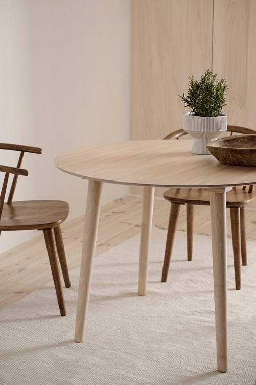 Bord med skiva av fanerad MDF och ben av massivt gummiträ. Ø 106 cm. Höjd 76 cm. Bordsskivans tjocklek ca 2 cm. Lev. monterad (skruva endast på benen vid leverans). Vikt 22 kg.