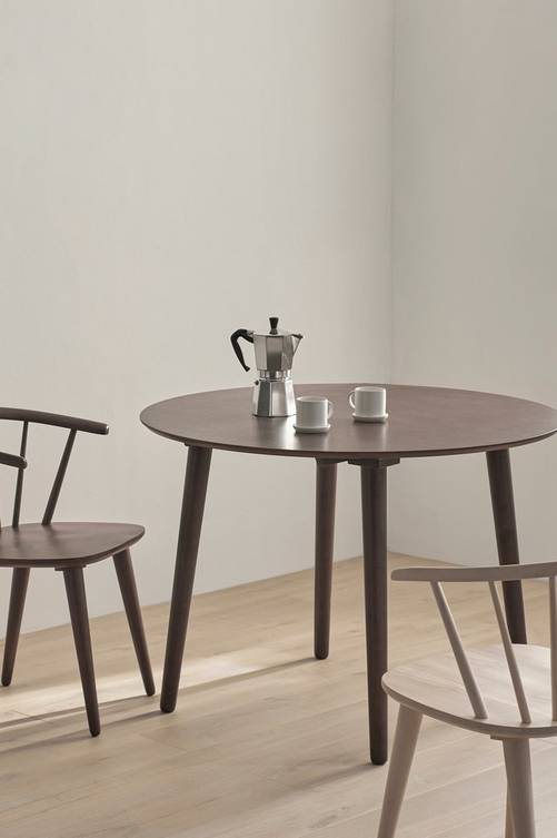 Bord med skiva av fanerad MDF och ben av massivt gummiträ. Ø 106 cm. Höjd 76 cm. Bordsskivans tjocklek ca 2 cm. Lev. monterad (skruva endast på benen vid leverans). Vikt 22 kg.