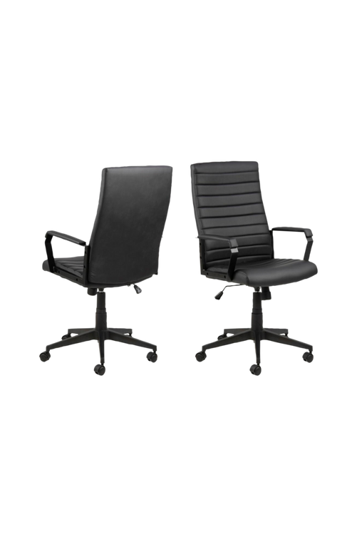 Få saker gjorda i den här moderna skrivbordsstolen med nylonbotten och konstläder klädsel. Gaslyftmekanismen erbjuder enkel sitshöjdsinställning för optimal komfort. Det stödjande ryggstödet och armstöden uppmuntrar dig att behålla en bra hållning.